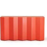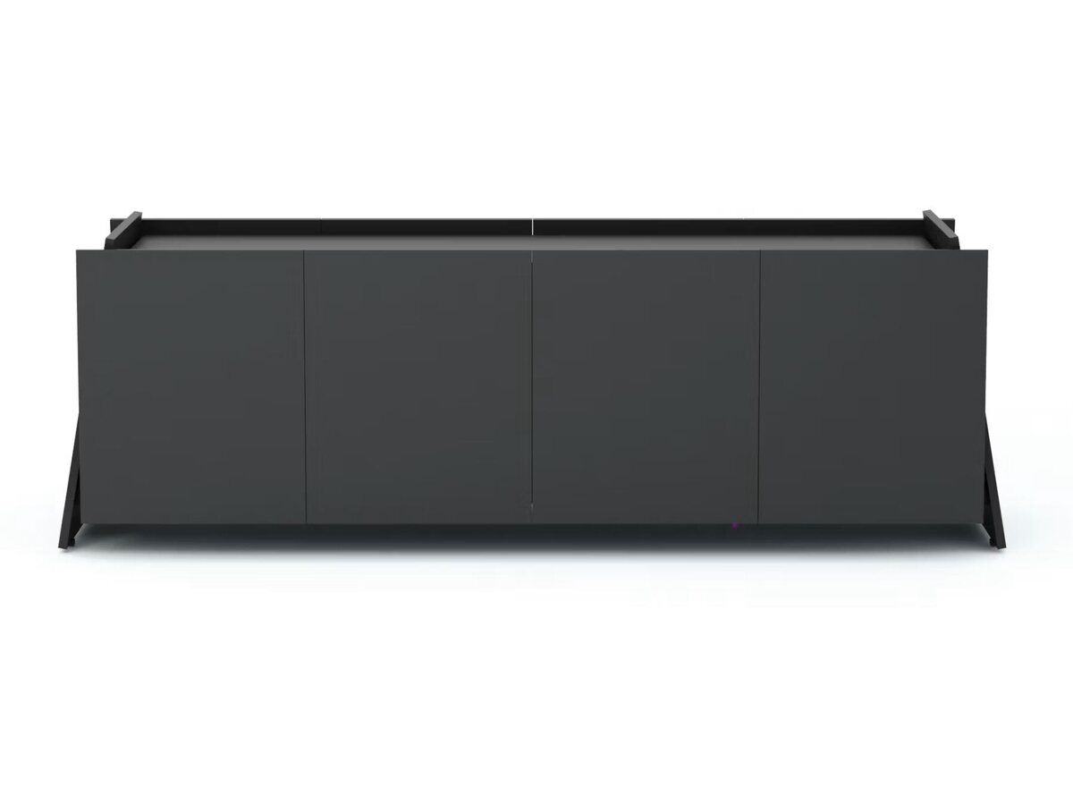 The Glass Display Sideboard by Air Division showcases a solid wood frame with glass panels and sliding doors. Its design features gracefully curved corners and tapered legs, blending contemporary style with timeless elegance.