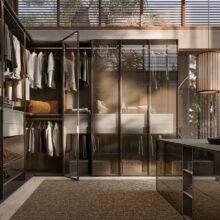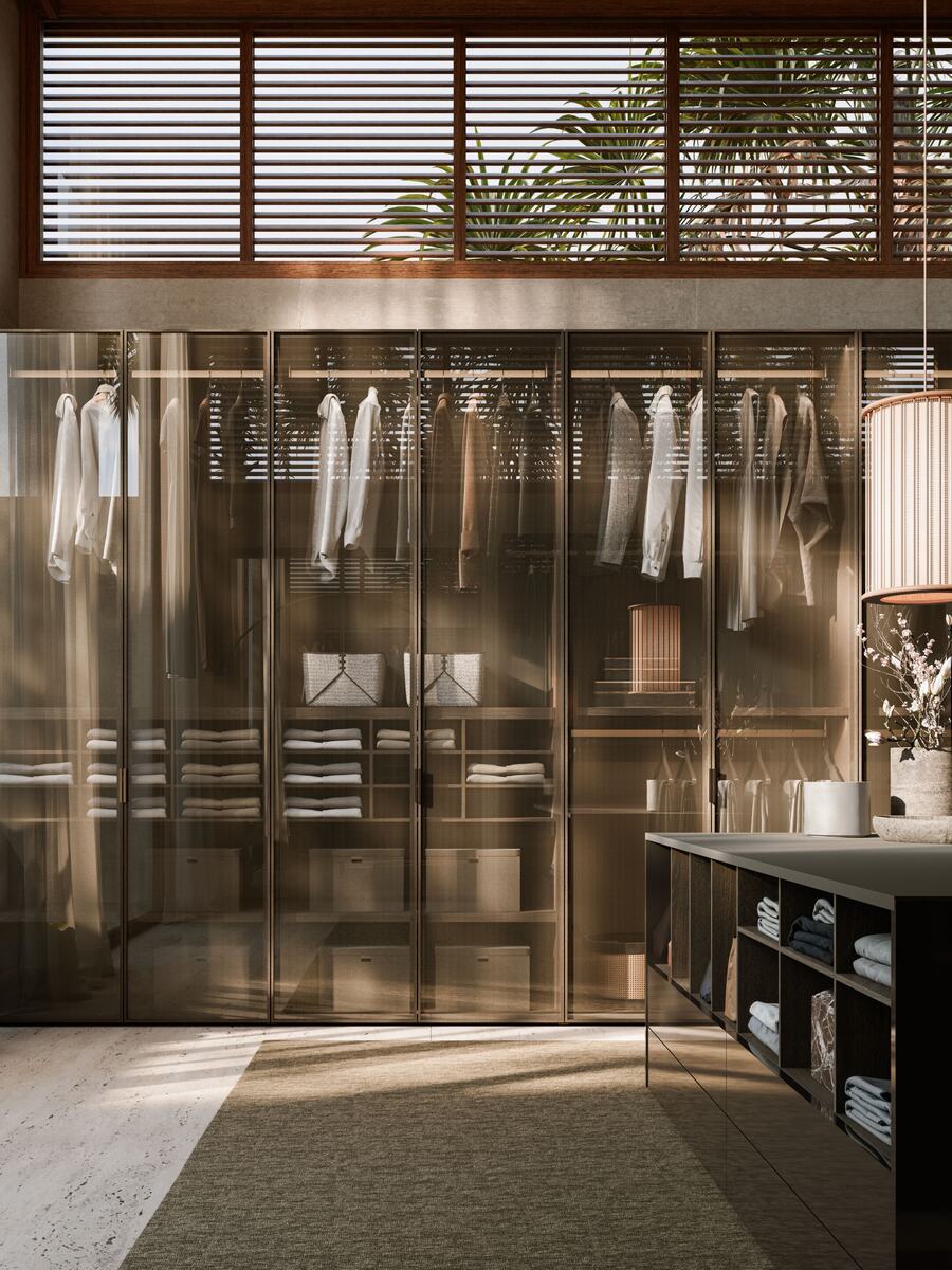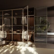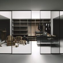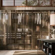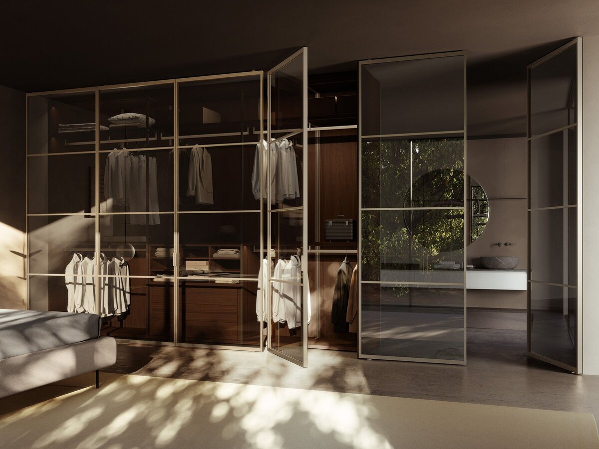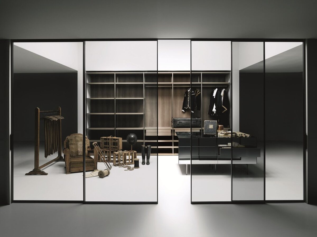 The Antibes Wardrobe by Boffi features a modular design with aluminum frame, glass or melamine panels, and internal drawers. It’s ideal for fully personalized storage.