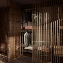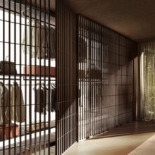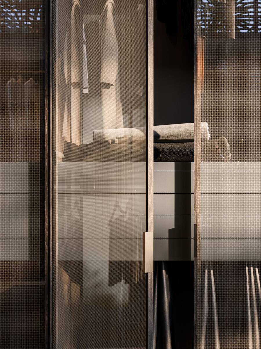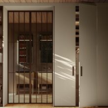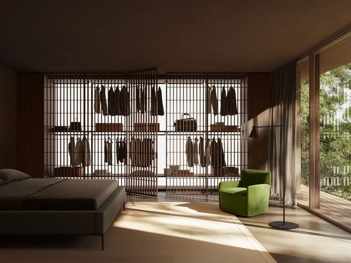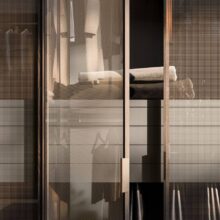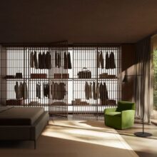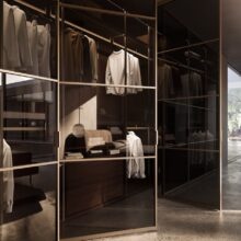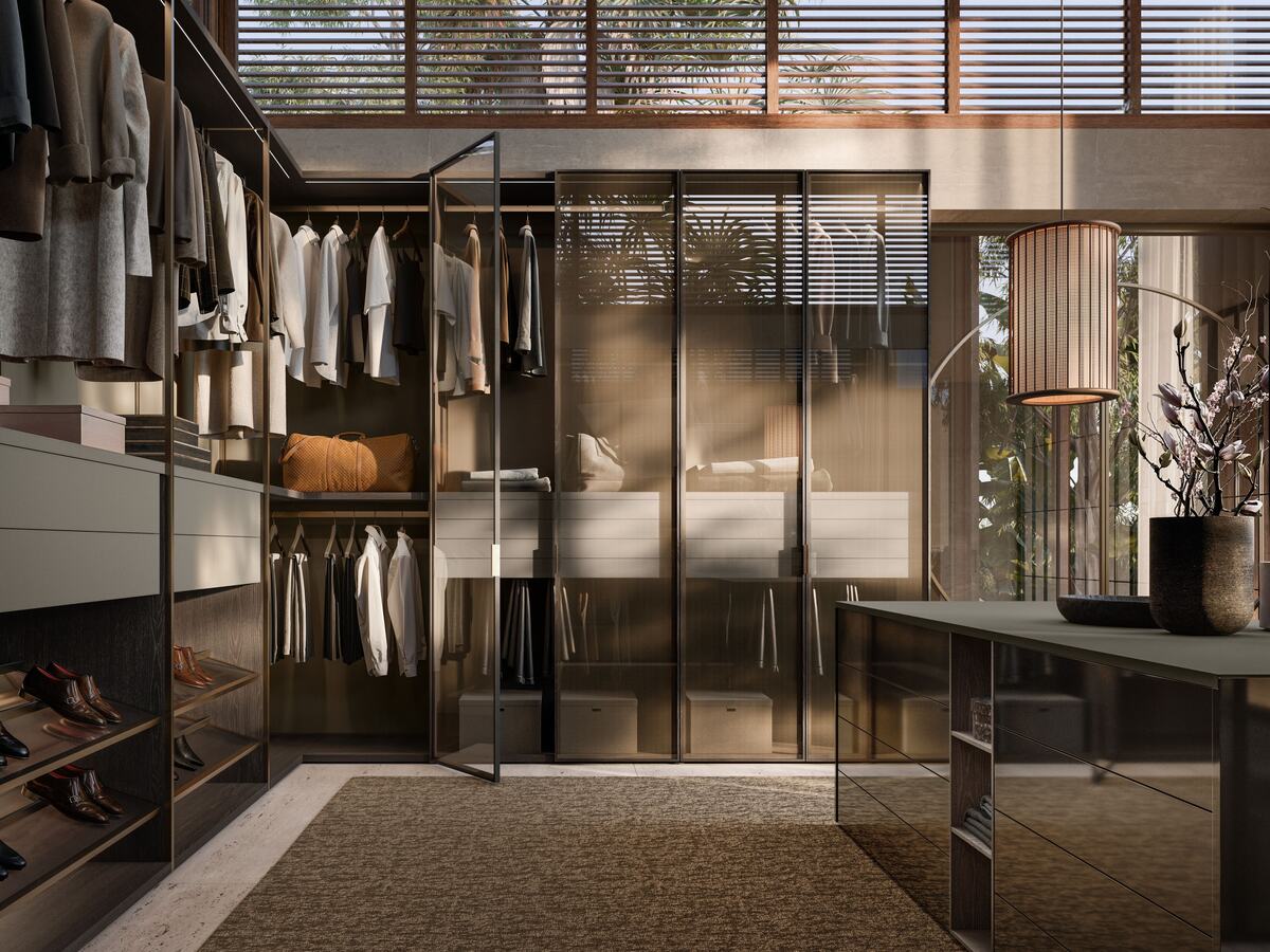 The Antibes Wardrobe by Boffi features a modular design with aluminum frame, glass or melamine panels, and internal drawers. It’s ideal for fully personalized storage.